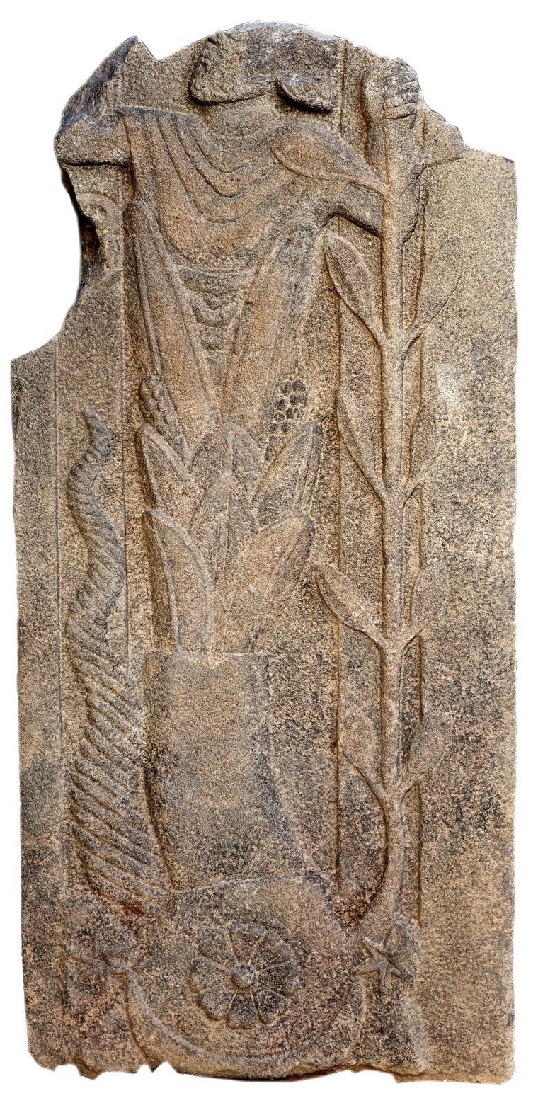 На базальтовой стеле, сохранившейся в отличном состоянии, бородатый мужчина стоит в чаше, образованной листьями и початками кукурузы. На стелу также нанесены астрологические символы. Форма бороды божества, его поза и позиция рук указывают на то, что его изваяли в первом веке нашей эры. Культ Юпитера Долихена активно насаждался римскими властями на востоке империи в первые века нашей эры.