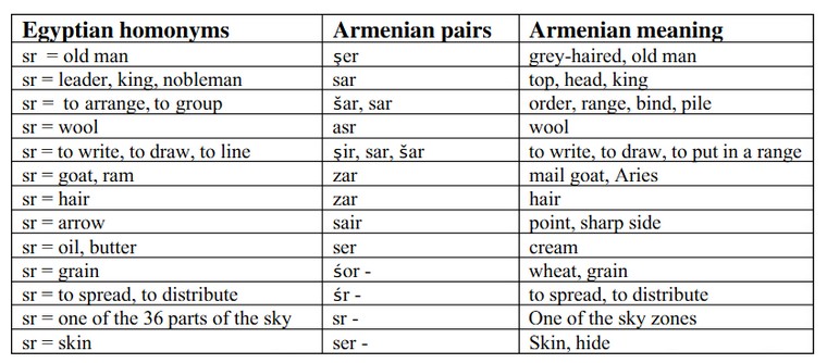 Необходимо изучить омонимы шумерского слова «сэр» и египетские слова «sr, zr», чтобы доказать, что эта гипотеза заслуживает доверия. Автор этой теории также представит свое исследование по шумерским образцам в другой статье. Омонимы египетских слов «sr, zr» и соответствующих армянских пар упоминаются в таблице ниже. Еще один важный аспект, который необходимо отметить, заключается в том, что египетская система письма основана на согласных.