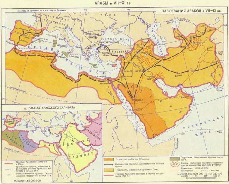 В 30-х гг. VII в. возникло новое государство, в основе которого легла новая религия – ислам. Во время пика своего могущества Арабский халифат включал в свой состав земли от Испании до Индии. В свое время это было крупнейшим политическим образованием.