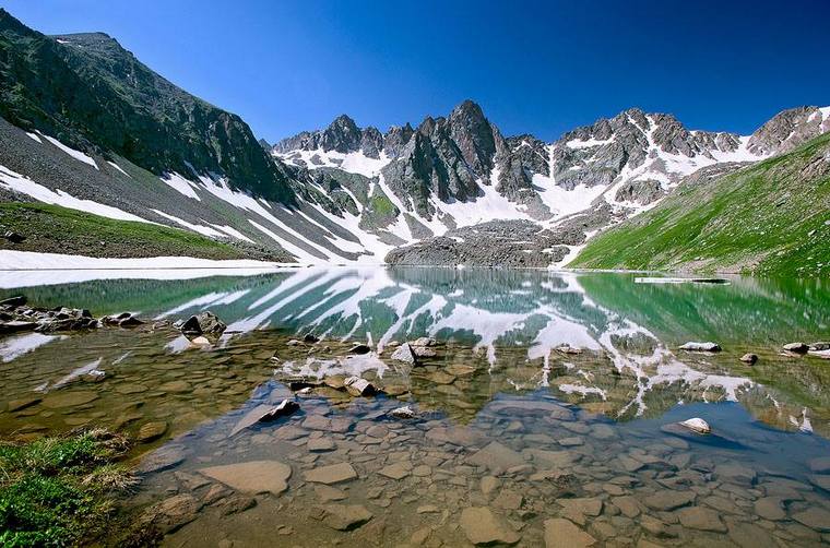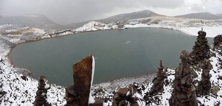Озеро зимой большей частью покрыто снегом и льдом. Расположено на высоте 3207 м над уровнем моря, на плато, под горными пиками.
