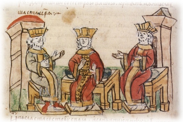 «Князь рузов» принимает таинство Св. Крещения. По преданию Вел.кн. Владимир, будучи в военном походе на Константинополь, заболев, внезапно ослеп (как известно, у Древ. Руси было 6 походов в Византию /860-988 г.г.). По старинной летописи царевна Анна «Багрянородная» (964-1012?/15 ? г.г.) передала князю послание: «Если не крестишься князь, то не избежишь недуга своего».