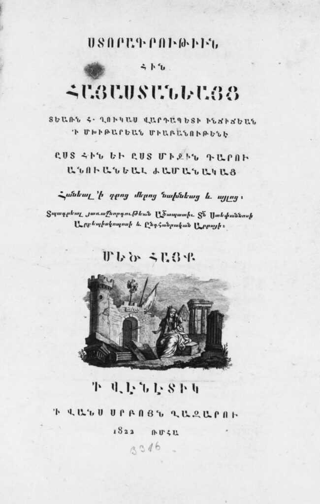 Трёхтомник “Древняя география Страны Армянской” (1835) — это первая крупномасштабная работа после “Истории Армении” Чамчяна, в которой автор подробно рассказывает о географии, административном делении, законах, науке и искусстве, этнографии древней Армении и о ряде других вопросов.