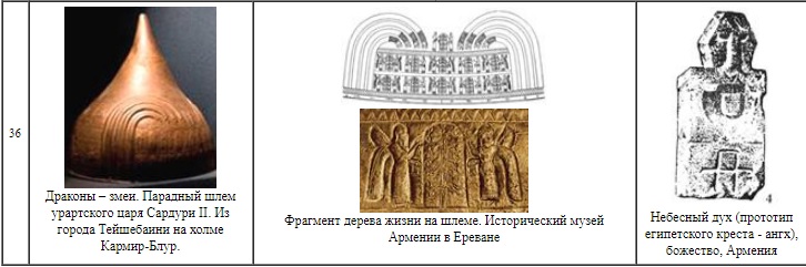 На парадном шлеме урартского царя Сардури II (рис. 36.1,2, таблица 1) изображены четыре пары змей-драконов. Они устремлены к древу жизни, охраняемому крылатыми божествами. В музее духовного и религиозного центра армянства в городе Эчмиадзине хранятся многие образцы христианского искусства с изображениями змей и драконов.