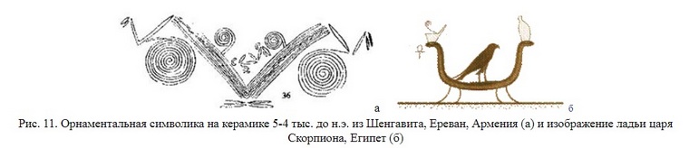 Орнаментальная символика на черной полированной керамике из Шенгавита (рис. 11а) напоминает сюжет орнаментики египетских артефактов (ладьи, рис. 4 и расчески, рис. 9). Если на шенгавитской керамике огромные небесные птицы в стилизированной форме напоминают склоны двух гор (рис. 11а), то в египетском артефакте (рис. 4 и рис. 11б) змеи формируют две половинки ладьи. На шенгавитском артефакте (рис. 11а) две пары “ног” сходят с центра композиции в противоположные стороны, на египетском – две пары весел направляют половинки ладьи в разные стороны.