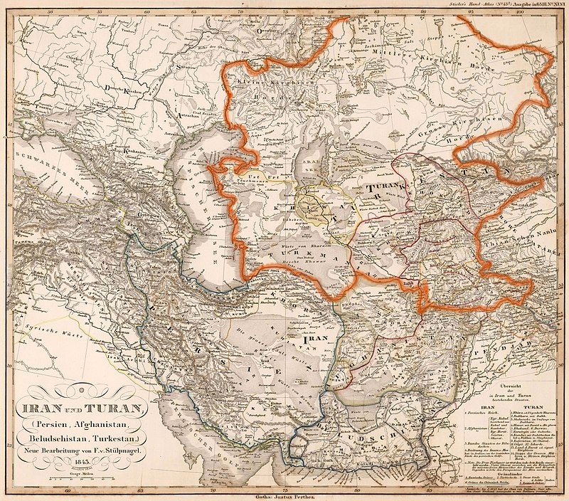 Немецкая «Карта Ирана и Турана», датированная 1850 годом (во времена династии Каджаров). Территория Турана обозначена оранжевой линией (здесь усилено). Название «Туран» появляется к востоку от Аральского моря. Согласно легенде (внизу справа на карте), Туран охватывает территории современных Казахстана, Узбекистана, Таджикистана, Туркменистана и северные провинции Афганистана и Пакистана. Эта область примерно соответствует современной Центральной Азии. Список областей, упомянутых на карте как часть Турана: 1. Хорезм 2. Бухара с Балхом 3. Шахрисабз 4. Гиссар 5. Коканд 6. Дарваз 7. Каратегин 8. Кундуз 9. Кафиристан 10. Читрал 11. Гилгит 12. Искарду 13,14. Северные степи (Казахстан). wikipedia.org