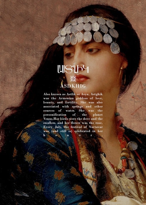 Астхик: связанная с любовью, красотой, плодородием и омолаживающей силой весны, Астхик — сияющая богиня купания в армянской мифологии. Как богиня водных источников, Астхик часто принимает образ рыбы в мифологических повествованиях, поэтому многие языческие каменные изваяния носят изображение рыбы.
