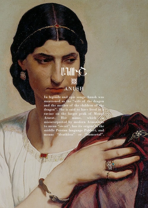 Ануш: что переводится как «бессмертная», богиня Ануш, согласно легенде, была женой дракона и жила на вершине горы Арарат. Интересно, что в современном армянском языке смысловой перевод термина «Ануш» в том числе означает «дорогой», что в свою очередь может свидетельствовать о непреходящем благоговении перед этой божественной фигурой.