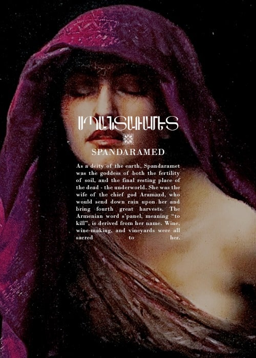 Спандарамет: богиня Спандарамет олицетворяет и жизнь, и смерть. Она часто ассоциируется с самой Землей, дающей жизнь и принимающей в свои недра умерших. Из-за ее связи с плодородной почвой Спандарамет выражает благодарность за виноградники и виноделие.