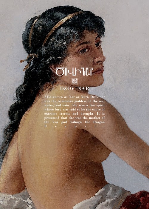 Цовинар (Нури или Нар): эта богиня олицетворяет море, дождь и стихии, контролируя наиболее изменчивые аспекты природы. Ее ярость могла вызвать разрушительные наводнения или сильные засухи. В некоторых мифах она изображается как мать бога-воина Ваагна.