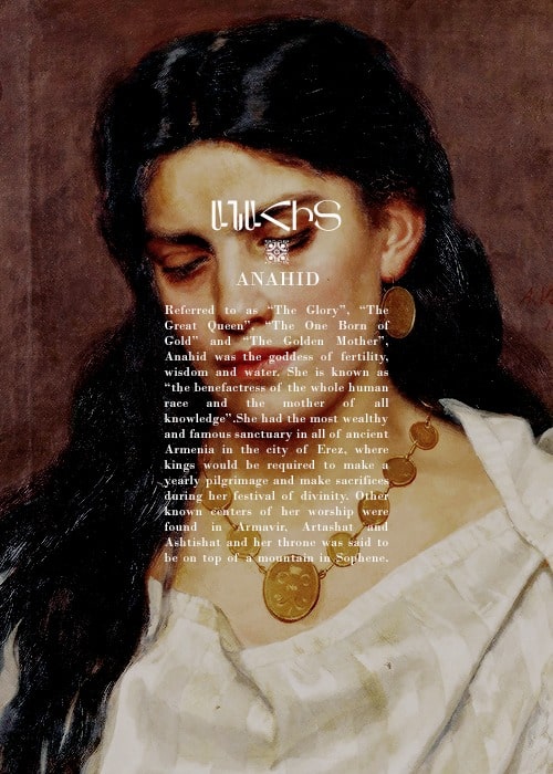 Анаит: считается главной богиней в армянском пантеоне, Анаит олицетворяет плодородие, красоту, мудрость, материнство и любовь. Почитаемая как благодетельница человечества, она получала щедрые пожертвования, особенно в канун праздника Навасард, празднования, знаменующего начало армянского Нового года.