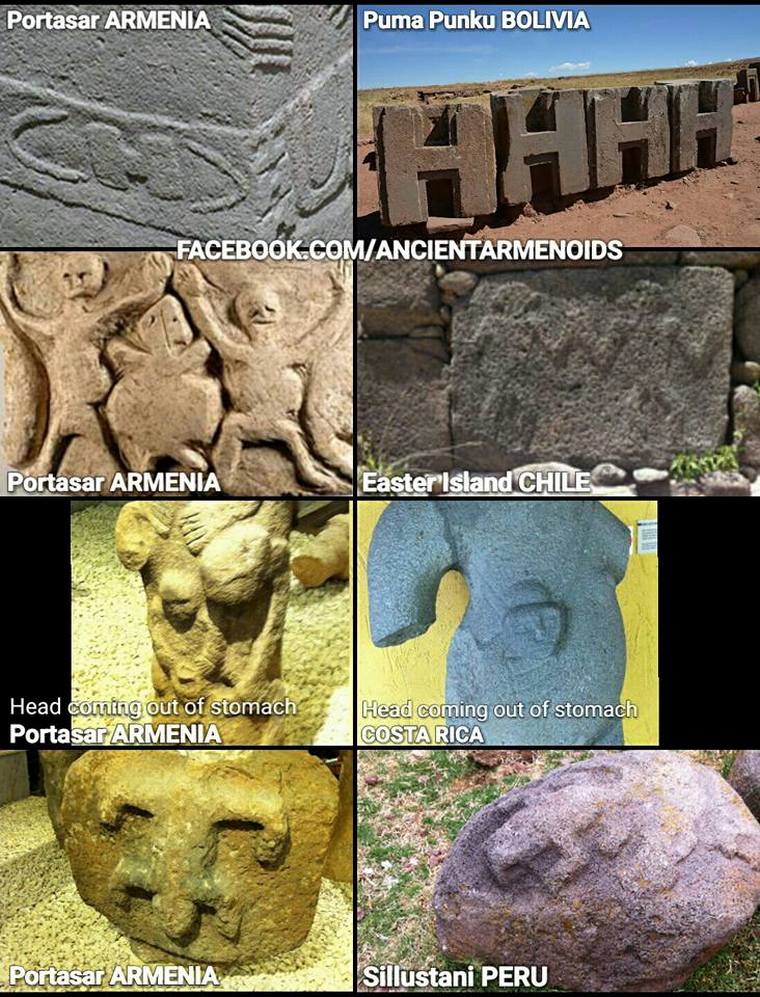 Существует также поразительное сходство между Среднеамериканскими мезоамериканскими скульптурами рептилий и резьбой рептилий армянами на мосте у Хачигюх, и на потерянных в лесах церквях, которые также напоминают фигурки животных, найденных в Портасаре. Источник: Ancient Armenoids