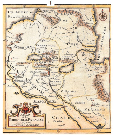 Карту составил англичанин Эммануэль Боуэн (творил в 1714 -1767 гг.). Здесь рай представлен на территории Исторической Армении, между озерами Урмия и Ван, имея в центре гору Арарат.