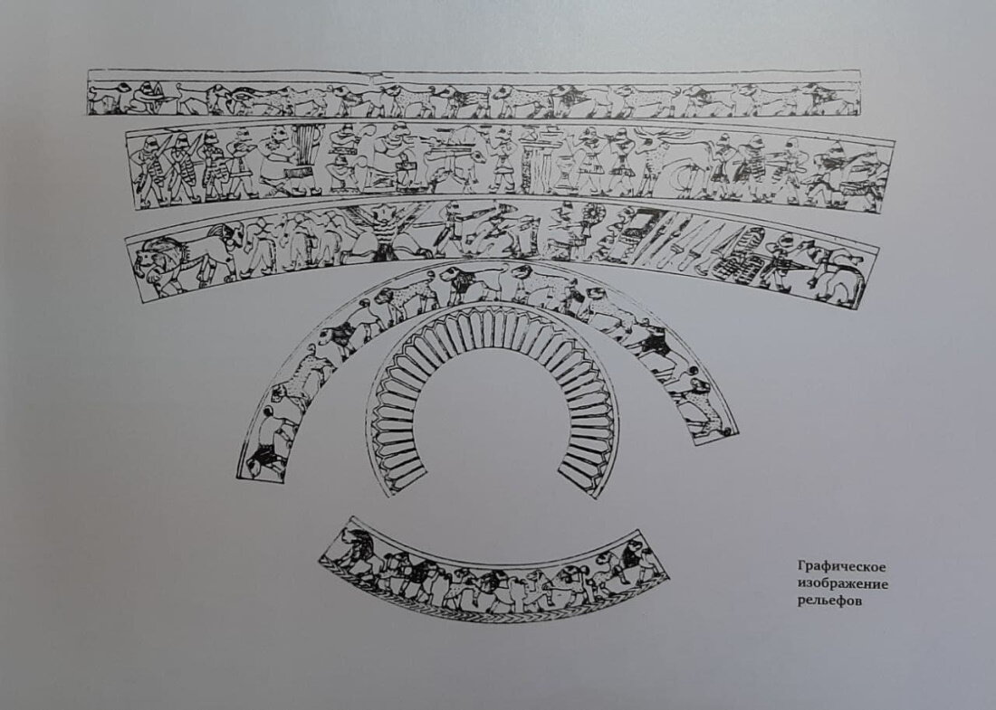 Как и на триалетском кубке, кульминацией композиции является фигура пирующего победителя, к нему направляется процессия с пленником, ему предназначаются богатые дары. Столы с зооморфными ножками имеют аналогии на триалетском кубке. В хеттских ритуалах особо отмечается «чистый стол царя». Властителя сопровождает та же собака, которая участвовала в охоте.