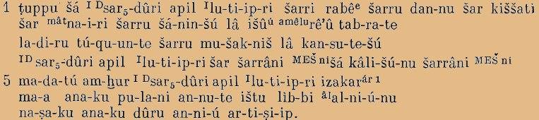 “Надпись Сардури, сына Лутипри, царя великого, царя могущественного, царя вселенной, царя страны Наири, царя, равного которому нет, удивительного пастыря, не боящегося2) сражения, царя, подчиняющего непокорных. (Я), Сардури, сын Лутипри, царь царей, который от всех царей получил дань. Так говорит Сардури, сын Лутипри: Я эти камни3) принес из города Алниуну (и) воздвиг эту стену”.