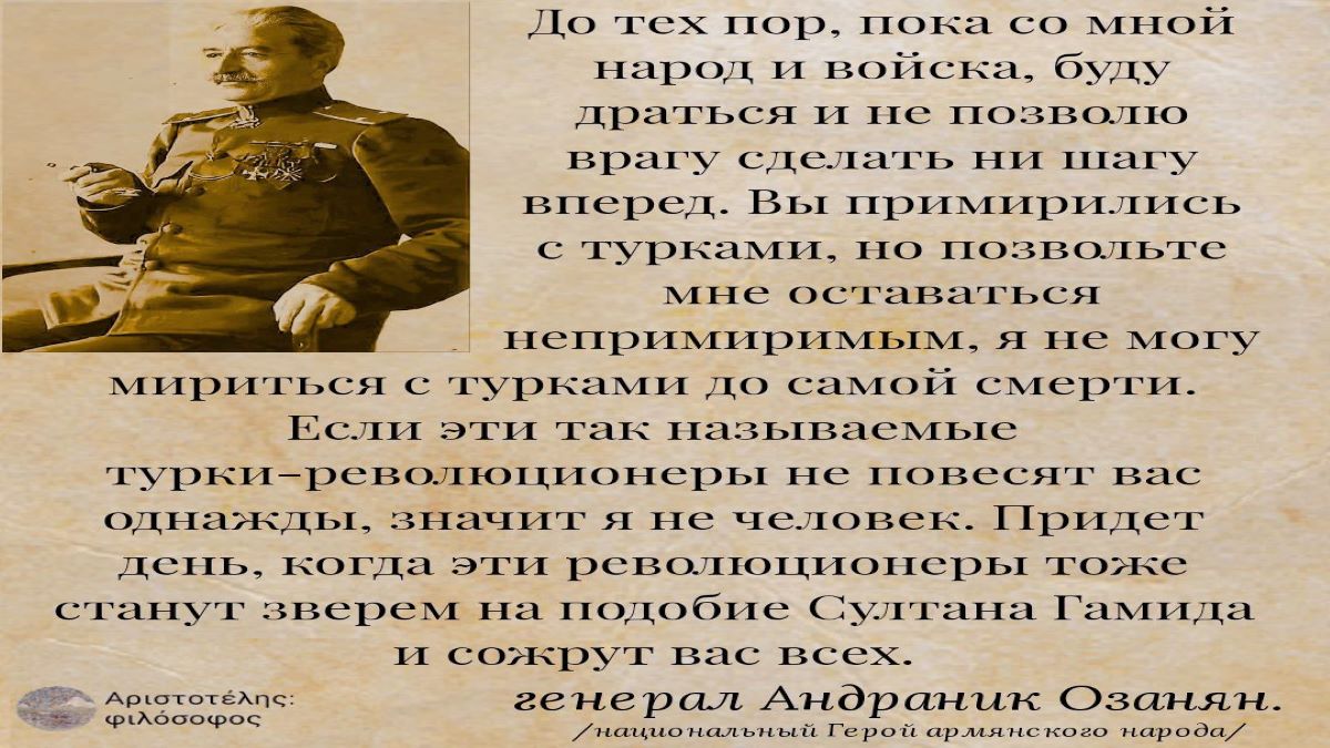 Легендарный Андраник Зоравар не был политиком вообще, он был воином и условия турок о мире генерал не признал. О чем и телеграфировал Назарбекову, католикосу и Национальному совету. Когда к Андранику явились уполномоченные турок и предъявили ему соглашение о перемирии с предложением подписать, гроза турок ответил им: “Эту кашу заварили дашнаки, вот их и потчуйте”.