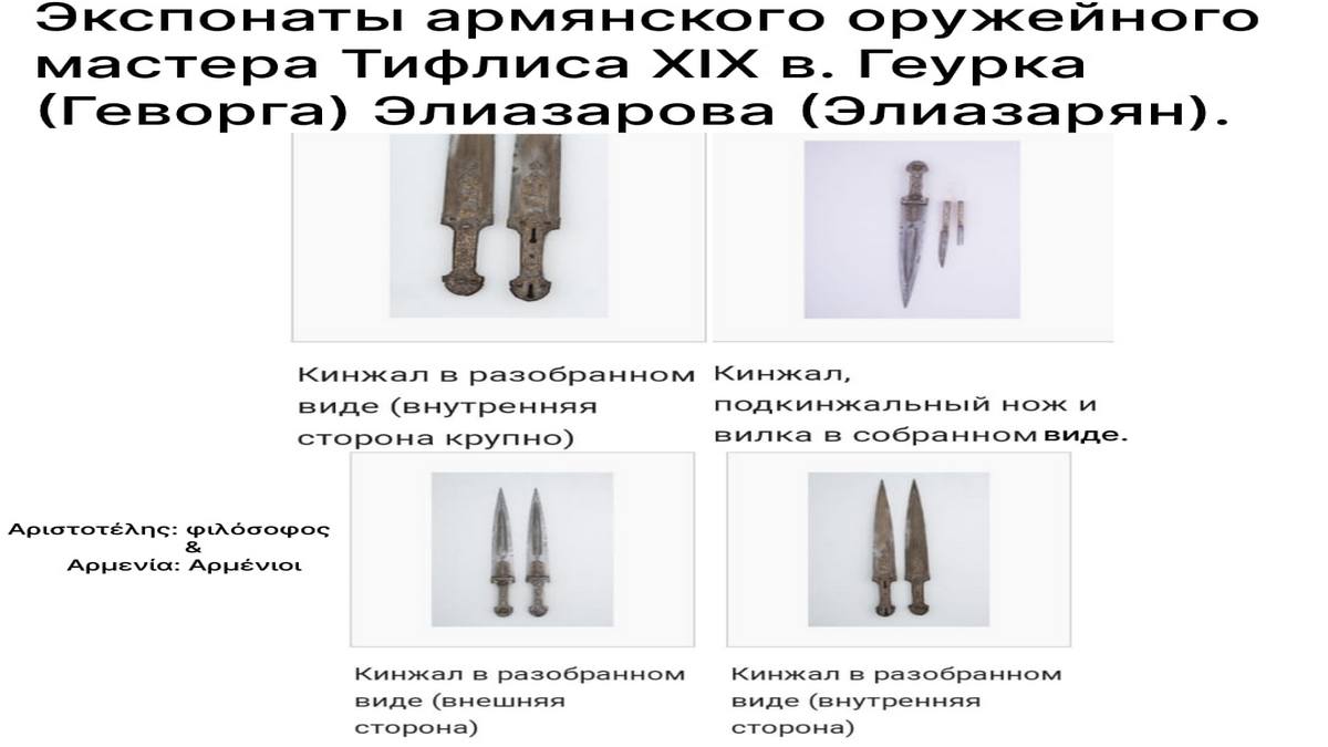 Известно также, что армянский мастер Геург поставлял оружие императорскому двору при Александре I и Николае I и обязательно делал надписи «Работал Кеурк», «Мастер Георг Тифлисский» или «Работа оружейника Его Величества».