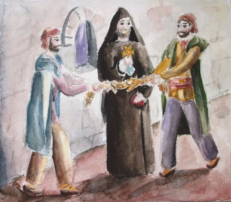 После того как совершается крещение, он берет ребенка, заворачивает в простыню, посланную им в дом роженицы и принесенную в церковь повивальной бабкой, а потом отправляется в дом жениха. Там его встречает мать новорожденного, которая встает на колени перед ним, целует его ноги и только после этого забирает ребенка.