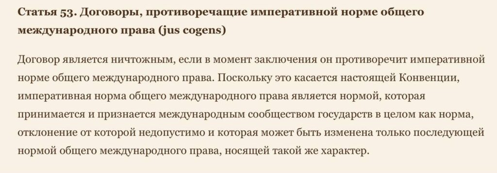 Следовательно, Московский договор был заключен изначально незаконно, и об этом наглядно повествуется в очень важном положении — статье 53 Венской конвенции (если договор противоречит изначальным положениям, то договор недействителен):