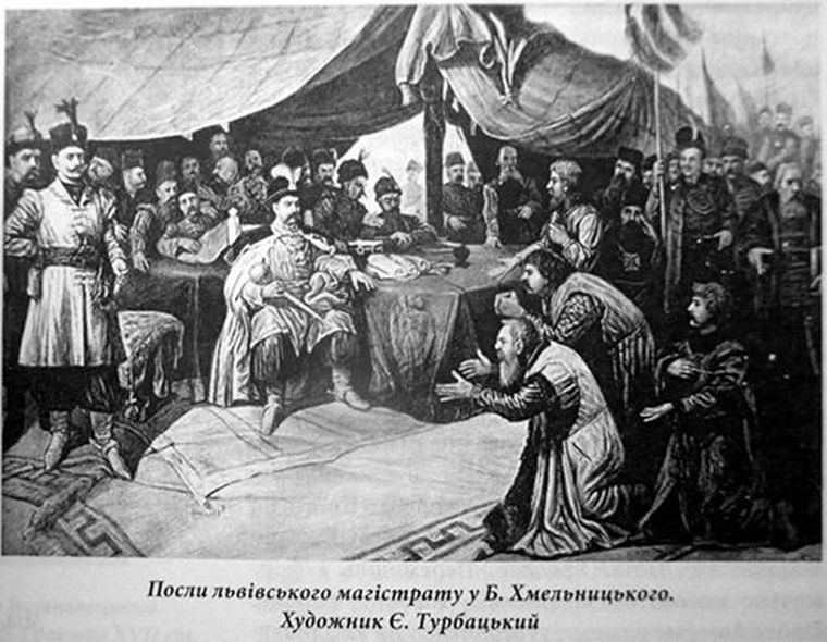 Художник Евгений Турбацкий (Євген Турбацький – украинский мастер из когорты художников-импрессионистов) изобразил львовское посольство в стане Б.Хмельницкого – в его составе доктор прав Самуель Кушевич, “сеньор армянской нации” Христофор Захнович и купець-русин Павел Лаврисевич.