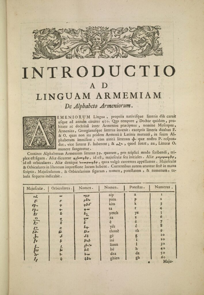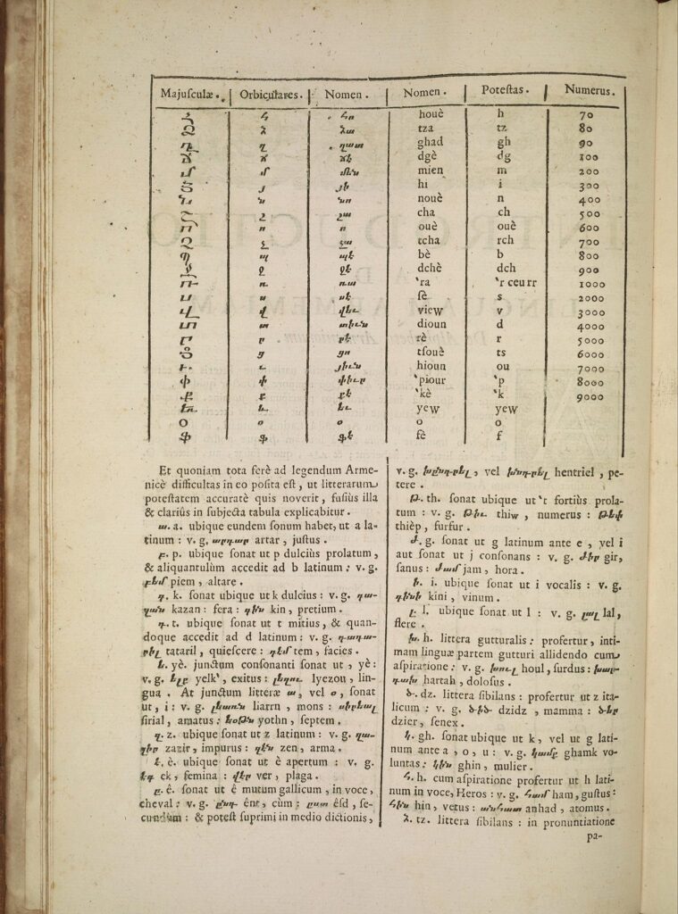 Одной из самых ценных частей словаря является таблица армянского алфавита, представленная в латинской транскрипции и сопровождаемая описанием числовых значений букв — важного элемента армянской письменной традиции.