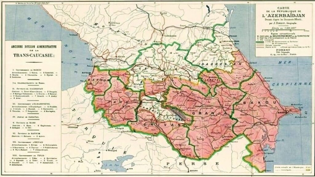 Ниже представлена карта 1919 года, представленная официальными представителями Баку Парижской Ассамблее мира. Эта карта подчеркивает территориальные претензии и амбиции того времени.