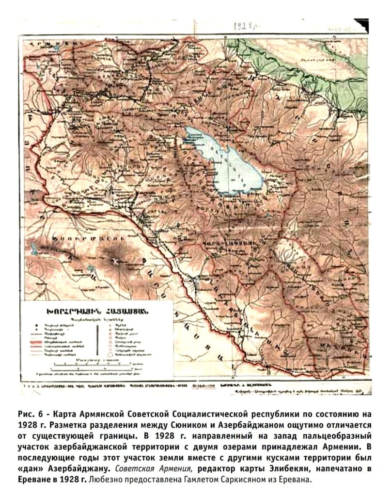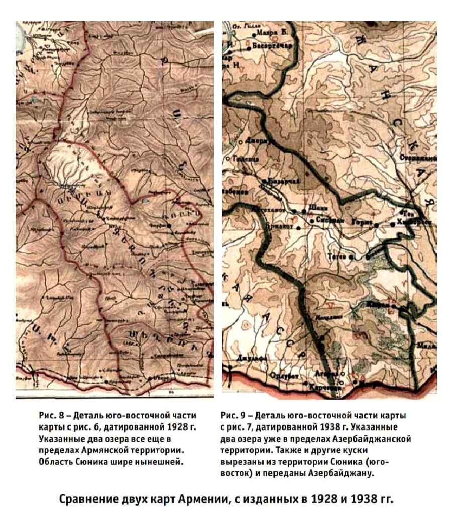 Согласно карте 1928г., участок Сюника, переданный впоследствии Азерб. ССР, а также два озера входят в состав Армянской ССР. На карте 1938г. отражено, что (в сравнении с картой 1928г.) значительные армянские территории отданы (непонятно, по какому праву и на каком законном основании) Азерб. ССР и Нахиджеванской автономии.