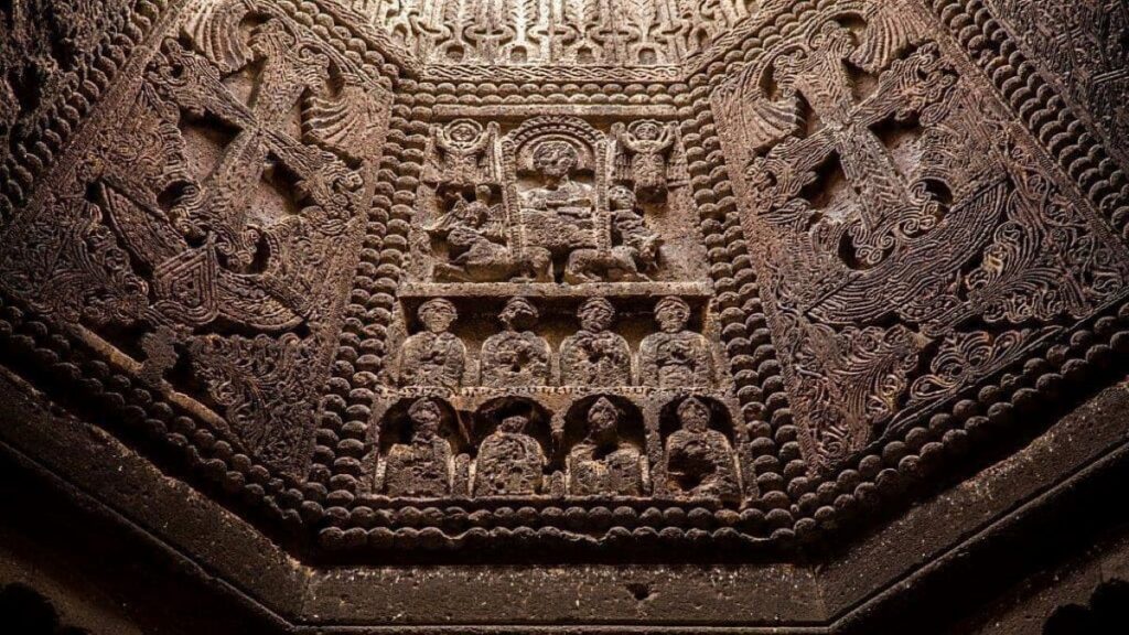 Особенно впечатляет купол вестибюля монастыря. Его замысловатые узоры, запечатленные на фотографиях, представляют собой танец геометрического мастерства и плавных мотивов. Он прекрасно олицетворяет слияние декоративного мастерства Ани с вдохновением как византийского, так и местного армянского стилей.