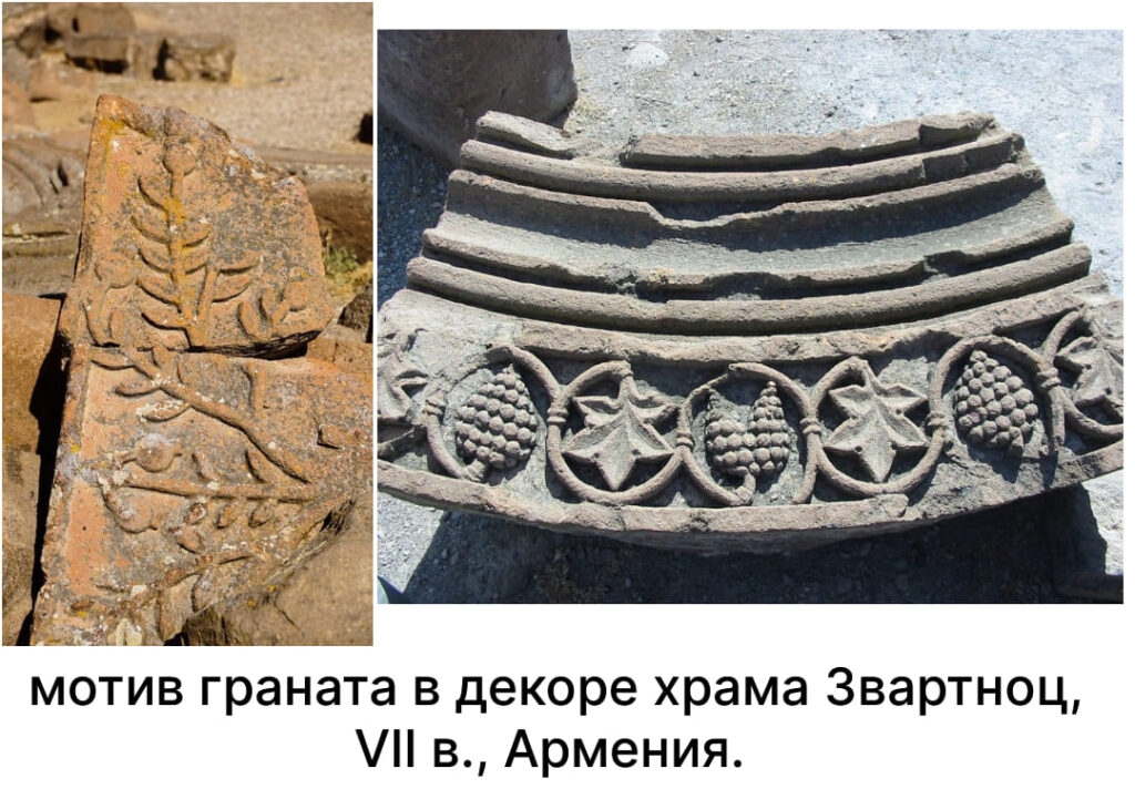 Мотив граната в Армении стал возрождаться с возведением в VIIв. храма Звартноц католикосом Нерсесом III Тайеци. Гранат в Звартноце изображен не схематично, а «живо» – в виде кустов.