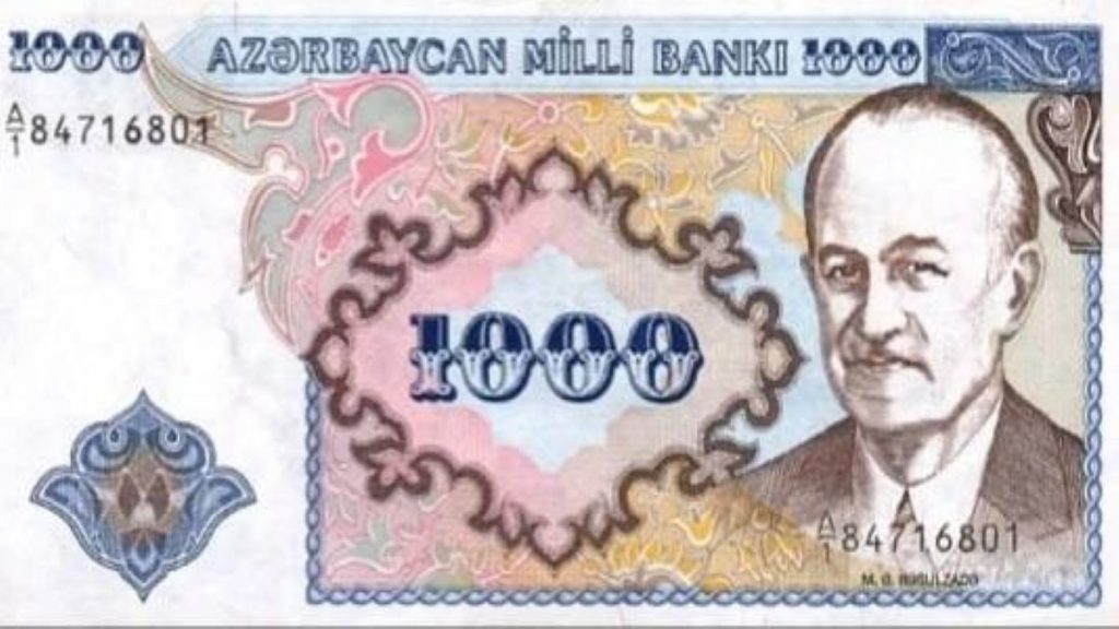 На фото – азербайджанская банкнота номиналом 1000 манат, на которой изображён пособник нацизма и по совместительству основатель Азербайджана – Расулзаде.