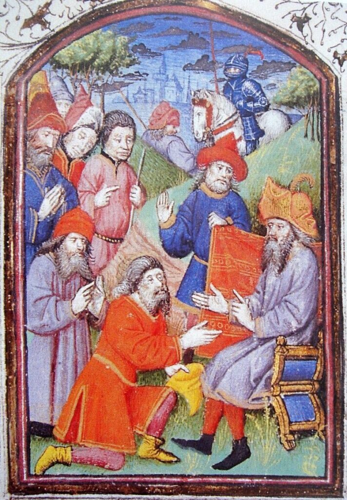 Царь Армении Хетум I (сидит) при монгольском дворе Каракорума, «получение почтения монголов». Миниатюра из Histoire des Tartars, Хейтон Корикус, 1307