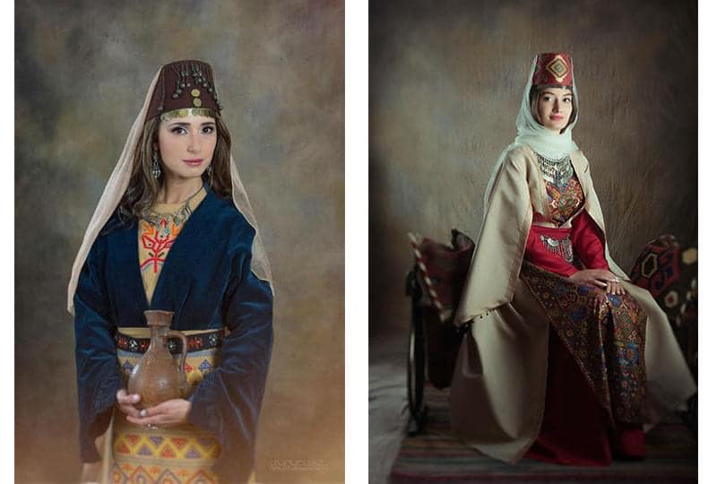 Характерный для Восточной Армении наряд включает в себя длинную красную рубашку (известную как “халав”) в сочетании с красными штанами под названием “похан”. Эти штаны, собранные у лодыжек, иногда выполнены из декоративной ткани, так как они видны под верхней одеждой. В этом контексте красный цвет символизирует женственность и плодородие. Над рубашкой и штанами женщины надевают платье. Сделанное из хлопка, атласа или шелка, оно представлено в оттенках синего, зеленого или фиолетового цвета. Аксессуары включают в себя серебряный пояс, головной убор, обувь, а в зависимости от социального статуса – также нагрудник с семейной вышивкой или пышное бархатное пальто.