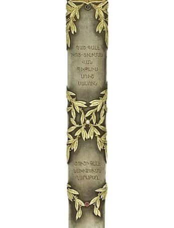 В богатой коллекции Музея истории Армении хранится предмет, который имеет не только историческую значимость, но и изысканное мастерство – сабля в комплекте с ножнами, изготовленная в Каире, Египет, в 1919 году. Этот необыкновенный образец истории был щедро подарен легендарному генералу Андранику Озаняну армянской общиной, проживающей в Египте.