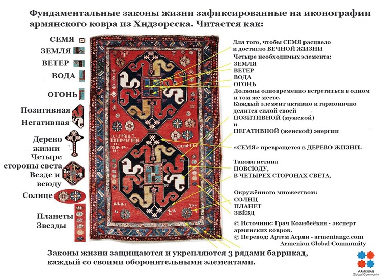 Грач Козибеёкян — эксперт армянских ковров, на своей странице в Facebook разместил изображение армянского ковра из Хндзореска на котором изображены фундаментальные законы жизни. Каждый элемент ковра имеет глубокий смысл.