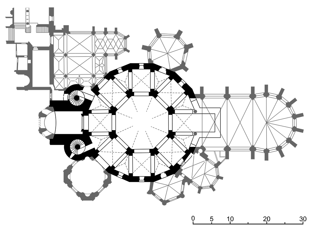 План собора, где черным цветом выделена схема Палатинской капеллы, с которой начал разрастаться собор. Источник: pinterest.com.au