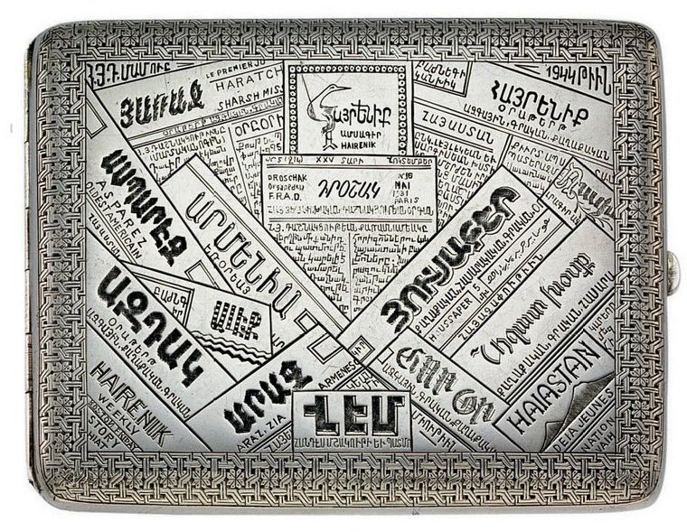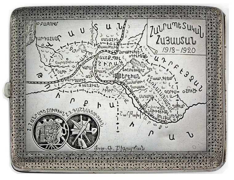 На крышке гравировка карты Армении с армянскими надписями, датированными 1918-1920 годами с гербом Армении и гербом партии Дашнаков.