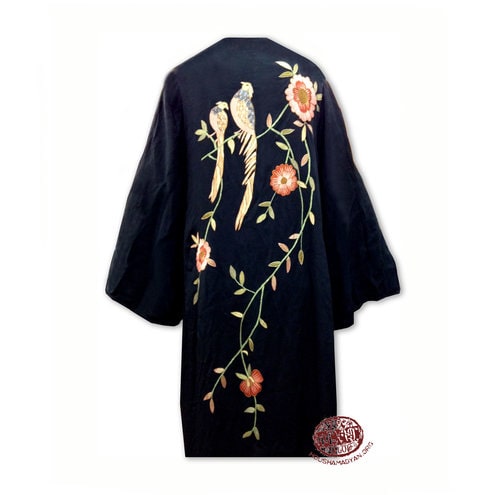 Продолжая осмотр халата, широкие рукава и общая форма одежды напоминают японский кимоно, популярный предмет в эпоху Жапонизма. Мотив цветущей ветви также напоминает о хризантемовых дизайнах китайского искусства, как и визуальный облик пары птиц.