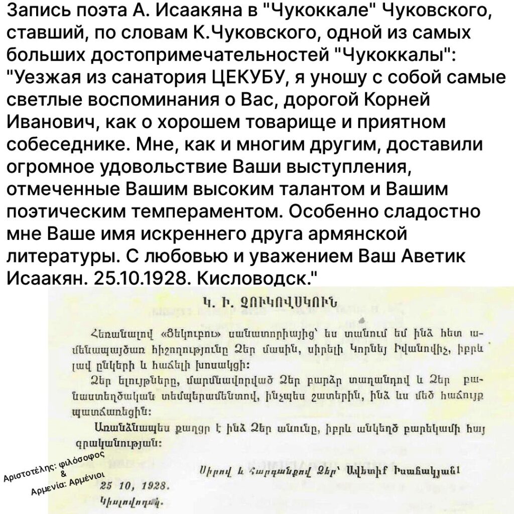 “Уезжая из санатория ЦЕКУБУ, я уношу с собой самые светлые воспоминания о Вас, дорогой Корней Иванович, как о хорошем товарище и приятном собеседнике. Мне, как и многим другим, доставили огромное удовольствие Ваши выступления, отмеченные Вашим высоким талантом и Вашим поэтическим темпераментом. Особенно сладостно мне Ваше имя искреннего друга армянской литературы. С любовью и уважением Ваш Аветик Исаакян. 25.10.1928. Кисловодск.”