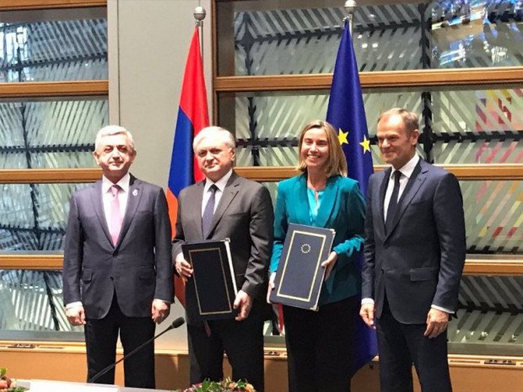 Армения и Евросоюз 24 ноября в рамках пятого саммита «Восточного партнерства» в Брюсселе подписали Соглашение о всеобъемлющем и расширенном партнерстве, которое стороны парафировали 21 марта 2017 года, пишет: panarmenian.net