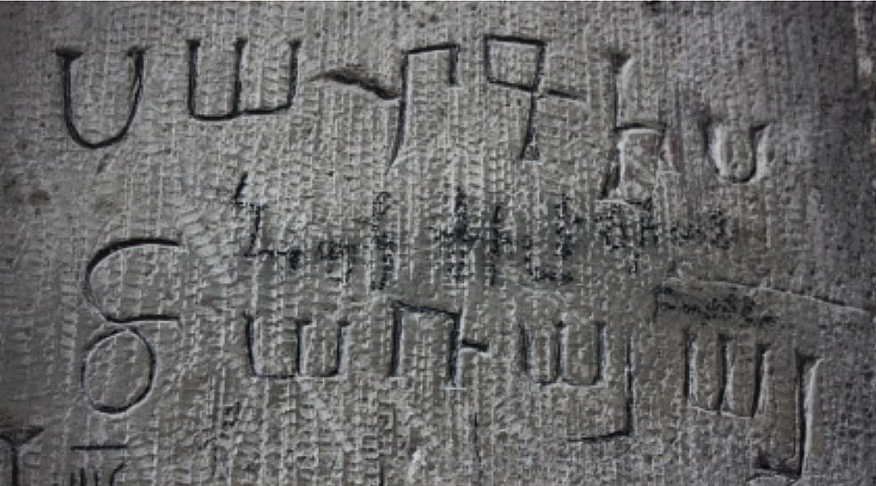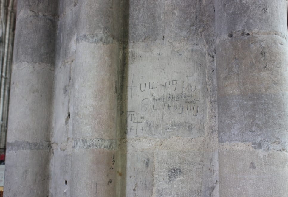Надпись обнаружена на внешней стене собора, среди множества других граффити, оставленных паломниками, мастерами и путешественниками на протяжении веков. Она выполнена на классическом армянском грабаре, что позволяет отнести её к XIII веку — периоду, когда армянские купцы, монахи и дипломаты активно путешествовали по Европе.
